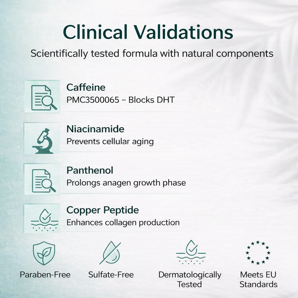 Each ingredient is selected based on scientific research, not trends.We focus on prolonging growth phase, supporting collagen production, and protecting the scalp environment essential for healthy hair density.